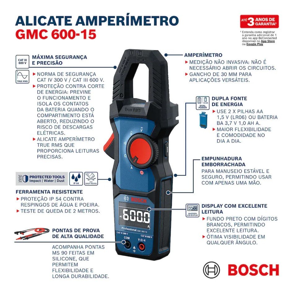 Alicate Amperimetro GMC 600-15 600A AC/DC CAT III 600V +Pilhas e Bolsa -Bosch