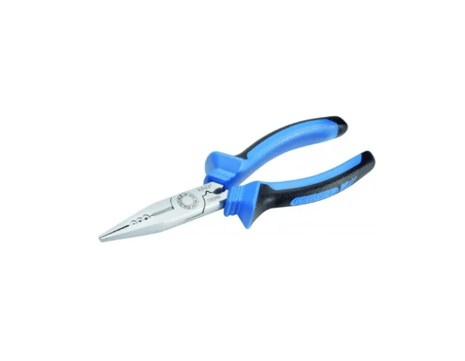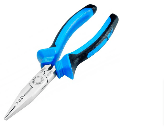 Alicate com bico semirredono, reto, ponta fina, com dentes finos e em paralelo, que permite puxar, segurrar, cortar, desencapar, amassar e crimpar fios e cabos. Indicado para corte de arame com dureza média.
