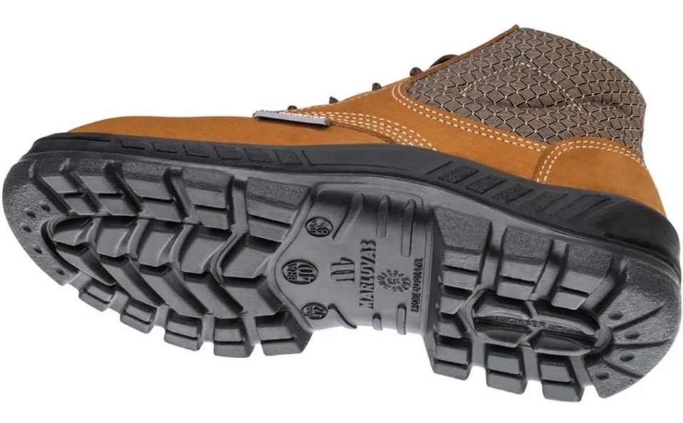 * Solado: Bidensidade, constituída por duas camadas de poliuretano (PU), sendo a camada mais externa mais resistente a lonas e graxas, oferecendo excelente aderência em diferentes tipos de piso e terrenos