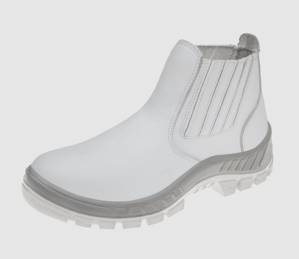 Botina de segurança confeccionada em microfibra branca com faixa cinza na parte inferior, ideal para profissionais do setor alimentício e da área da saúde. Conta com fechamento em elástico lateral, facilitando o calce com aba auxiliar. Possui biqueira de polipropileno (plástica), palmilha higiênica com proteção antibacteriana e palmilha de montagem em poliéster resinado.