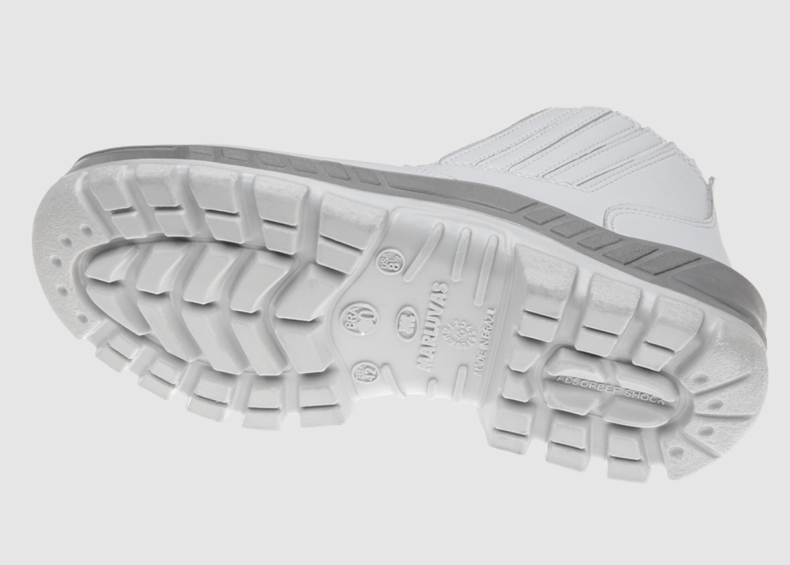 Botina de segurança confeccionada em microfibra branca com faixa cinza na parte inferior, ideal para profissionais do setor alimentício e da área da saúde. Conta com fechamento em elástico lateral, facilitando o calce com aba auxiliar. Possui biqueira de polipropileno (plástica), palmilha higiênica com proteção antibacteriana e palmilha de montagem em poliéster resinado.