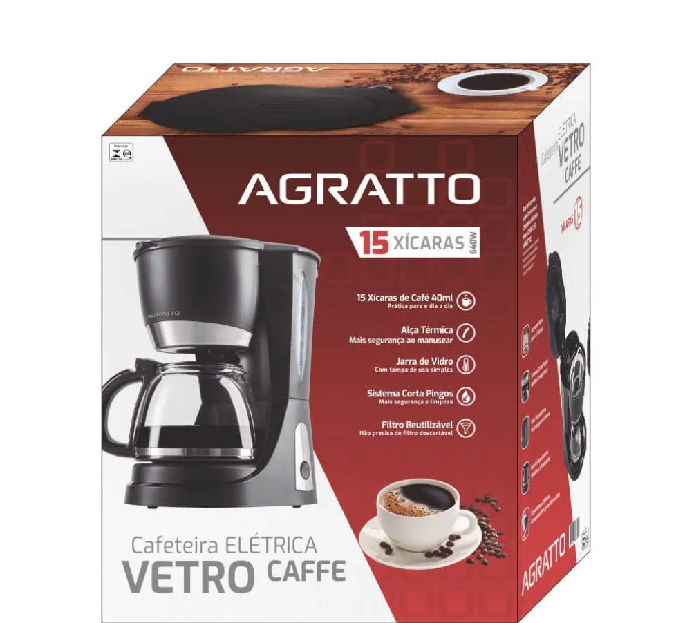 Saboreie um café fresquinho com a família. Que tal acordar super bem com a Cafeteira Elétrica Vetro Caffe 15X AGRATTO? Um café quentinho todas as manhãs com essa prática cafeteira, onde a base de aquecimento mantém seu café na temperatura perfeita. Mais praticidade e agilidade na hora de preparar o café para toda a família, e com a jarra de 15 xícaras ninguém vai ficar sem! Com a Cafeteira Elétrica Vetro você desfruta de todo sabor que seu café em pó favorito oferece, feito na hora que você quiser! Características -Para 15 Xícaras de café - Capacidade de até 0,6 Litros de água; -Jarra de vidro - Pode ser levada à mesa para servir o café; -Sistema Corta pingos - Sistema de alavanca que evita a sujeira e o perigo de se queimar com o café; -Nível do reservatório - Reservatório de água com nível medidor com marcação em xícaras; -Base de aquecimento - Mantém o café aquecido depois de pronto; -Filtro plástico reutilizável - Filtro reutilizável que evita o uso de filtros de papel. O que vem na caixa? Suporte para filtro Colher medidora Manual de uso. Especificações técnicas do produto: Comprimento: 22.0 cm Largura: 15.5 cm Altura: 25.5 cm Peso: 1,2 kg Embalagem: 23 × 16 × 27 cm Potência 550W Voltagem: 220V Frequência 60Hz Capacidade 0,6 Litros - 15 xícaras de café Cor Preto