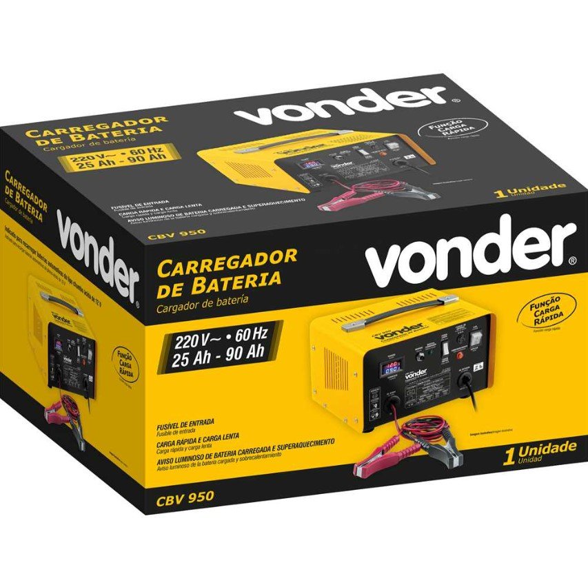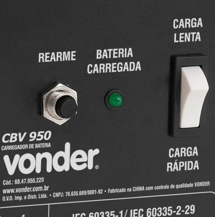 Carregador de Bateria CBV-950 9AMP 12V IP20 220V -Vonder Possui função carga rápida que agiliza o processo de carregamento, além de carga lenta. Conta ainda com fusível de entrada, proporcionando maior proteção e aviso luminoso de bateria carregada e também de superaquecimento. Oferece voltímetro e amperímetro digitais, facilitando a leitura de corrente e tensão de carga. Dados Técnicos: Modelo:CBV 950 Capacidade de carga da bateria:25 Ah - 90 Ah Tensão de saída do carregador de bateria:12 V Corrente de carga da bateria:Carga lenta 7 A / carga rápida 9 A Tensão:220 V~ Corrente de entrada (A):0,85 A Frequência:60 Hz Comprimento do cabo da garra:1,40 m Comprimento do cordão elétrico.:2,0 m Dimensões (C x L x A):210 mm x 265 mm x 170 mm. Segue norma:IEC 60335-1 e IEC 60335-2-29 Massa aproximada (peso):4,3 kg