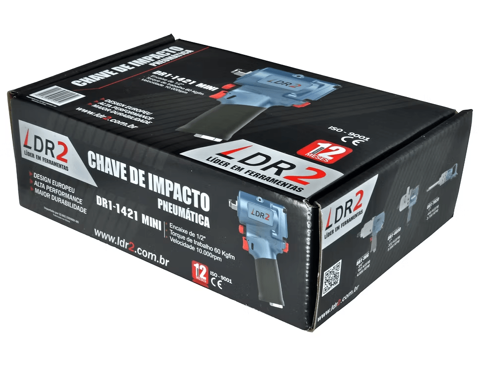 Mini Chave de impacto pneumática da linha industrial LDR2, indicada para aperto e desaperto de parafusos, em Auto Centers, oficinas mecânicas, concessionárias, borracharias, manutenção industrial e linhas de montagem Tipo: Pistola (Mini), com punho emborrachado Encaixe quadrado: 1/2" polegada Torque máximo (rev.): 71 Kgfm Sistema de martelo: Twin Hammer Velocidade livre: 10.000rpm Regulagem de torque: Sim (4 níveis + 4 no reverso) Peso: 1,34 Kg Comprimento da bigorna: 1" polegada Entrada de ar: 1/4" Mangueira de ar indicada: 5/16" Pressão de trabalho: 90 psi Consumo de ar médio: 10 pcm Embalagem: 1 caixa de papelão