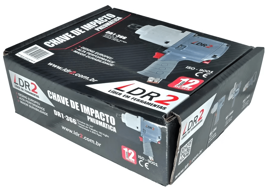Chave de impacto pneumática da linha industrial LDR2, indicada para aperto e desaperto de parafusos, em Truck Centers, oficinas mecânicas, concessionárias, borracharias, manutenção industrial e linhas de montagem. Tipo: Pistola, com punho emborrachado Encaixe quadrado: 3/4" polegada Torque máximo (rev.): 194 Kgfm Sistema de martelo: Pin-Less Hammer Velocidade livre: 4.800rpm Regulagem de torque: Sim (3 níveis + 3 no reverso) Peso: 5,5 Kg Comprimento da bigorna: 1,5" polegada Entrada de ar: 3/8" Mangueira de ar indicada: 1/2" Pressão de trabalho: 90 psi Consumo de ar médio: 20 pcm Embalagem: 1 caixa de papelão