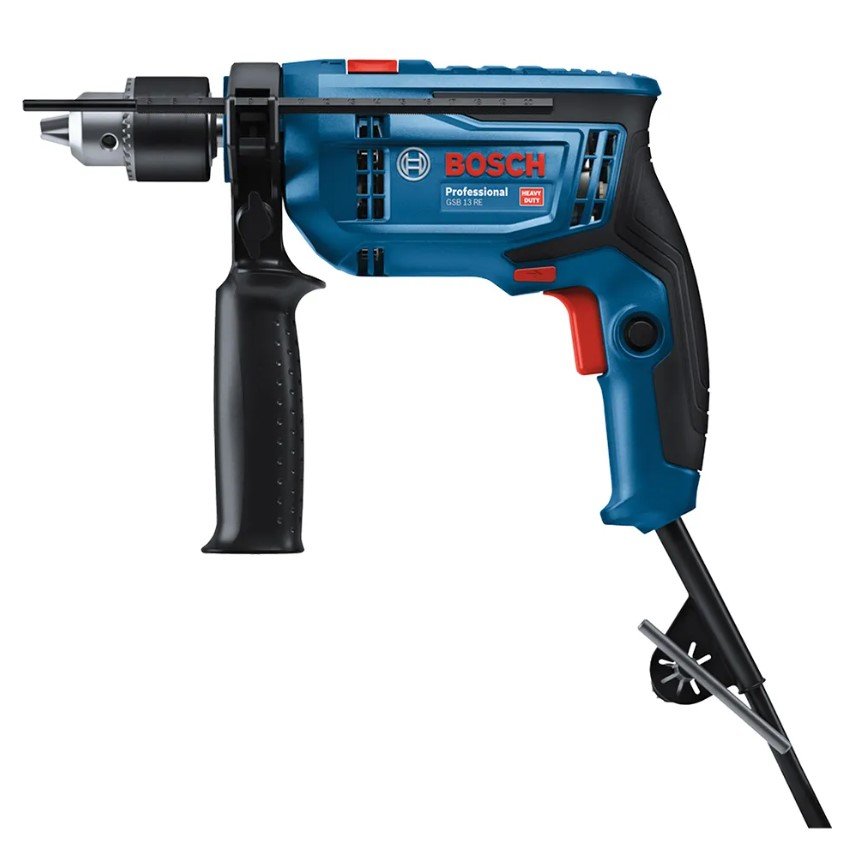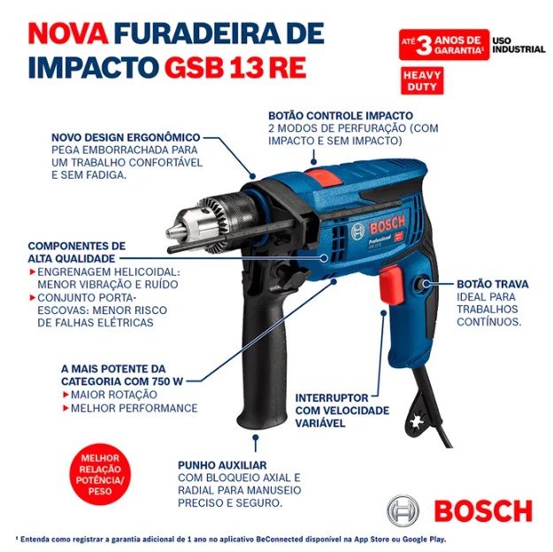 A Furadeira de Impacto Bosch GSB 13 RE possui uma potência de 750W, sendo indicada para perfuração em concreto, alvenaria, madeira e metal, tanto com quanto sem impacto. Ela apresenta menor vibração e menos ruído, além de contar com uma carcaça reforçada de alta qualidade que aumenta a vida útil da ferramenta. O interruptor de velocidade variável e o botão trava são perfeitos para trabalhos contínuos.