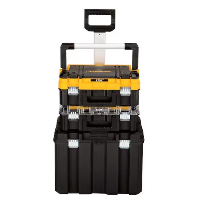 DWST60404 - TORRE MODULAR MÓVEL TSTAK 3 peças. -Torre - unidade de armazenamento móvel, organizador com tampa transparente e caixa de ferramentas com alça longa -Unidade móvel com rodas duráveis de 7 pol. e uma alça telescópica -Volume de armazenamento de alta capacidade devido à abertura exclusiva da tampa Características Adicionais -Fechos de metal antiferrugem -Dobradiças de metal para trabalho pesado -Pode ser empilhada entre si e com outros módulos TSTAK por meio de travas laterais, permitindo um transporte seguro e fácil