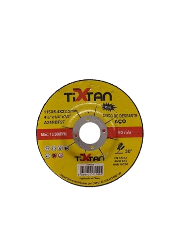Disco de Desbaste 4.1/2 X 6.5MM DTP7070 Tixtan Plus Descrição do Produto: Os Discos de Desbaste Premium Maqdima são a escolha ideal para quem busca eficiência, qualidade e segurança no desbaste de aço carbono. Importados com rigorosos padrões de fabricação, esses discos foram projetados para garantir performance superior e maior durabilidade em suas operações. Características Principais: Velocidade Máxima Permitida: 13.300 RPM (80 m/s), ideal para operações rápidas e precisas. Ângulo de Trabalho: Otimizado para uso em ângulo de 30°, garantindo um desbaste eficiente com menor esforço. Segurança Elevada: Fabricados conforme as exigências da norma internacional EN 12413, que assegura os mais altos padrões de segurança. Qualidade Premium: Alta resistência ao desgaste, proporcionando maior longevidade em operações de desbaste intensivo. Se você precisa de um disco confiável e de alta performance para seus trabalhos em aço carbono, os Discos de Desbaste da Tixtan são a solução perfeita. Segurança e qualidade que você pode confiar!