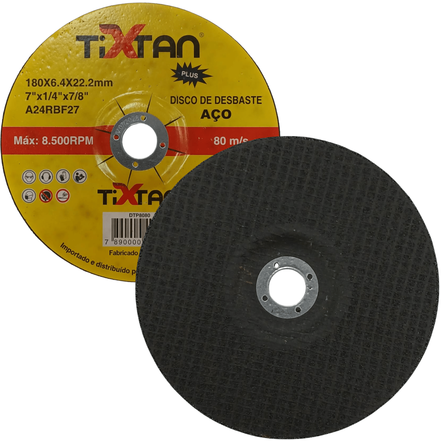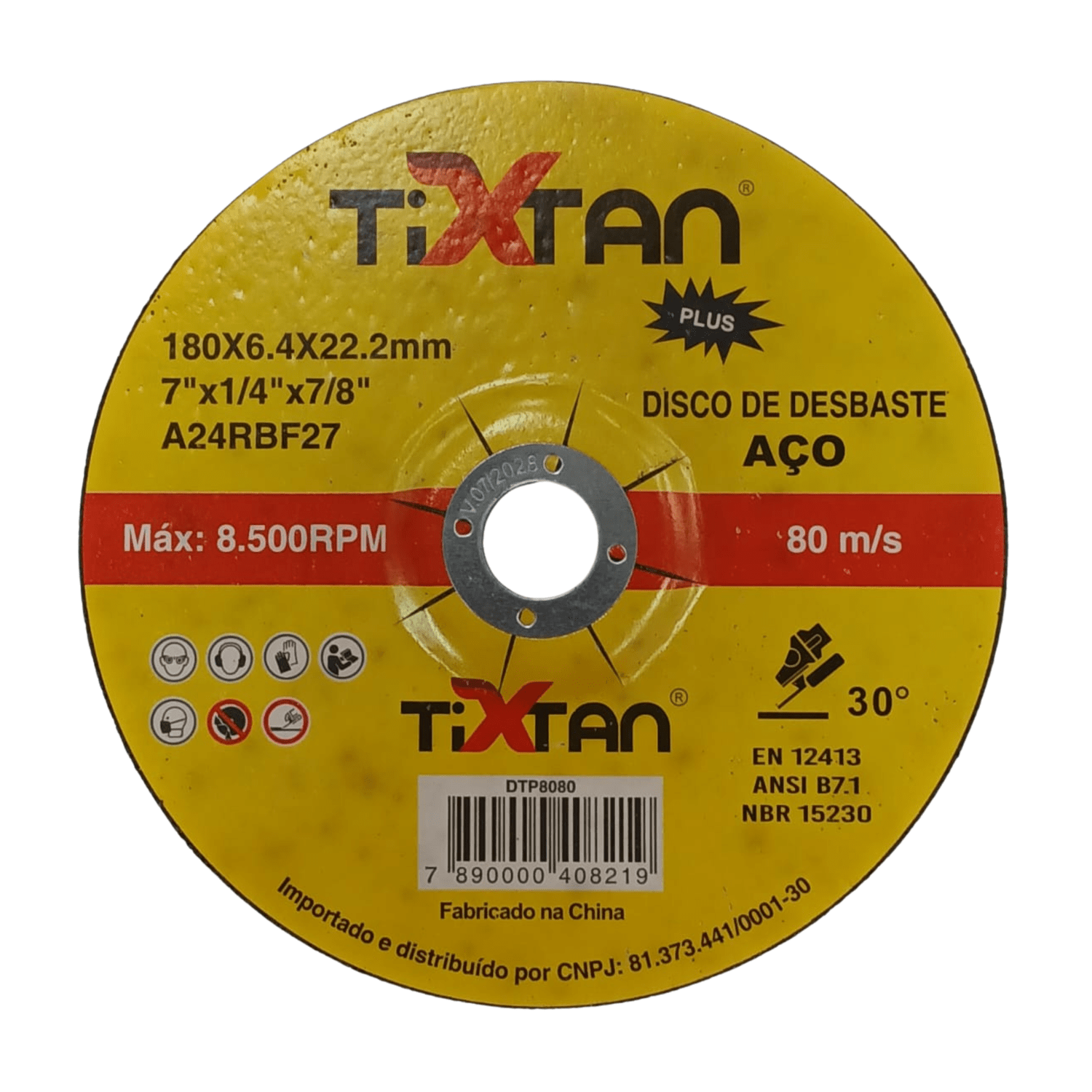 Disco de Desbaste 7'' X 6.5MM DTP8080 Tixtan Plus Descrição do Produto: Os Discos de Desbaste Tixtan Plus são a escolha ideal para quem busca eficiência, qualidade e segurança no desbaste de aço carbono. Importados com rigorosos padrões de fabricação, esses discos foram projetados para garantir performance superior e maior durabilidade em suas operações. Características Principais: Velocidade Máxima Permitida: 8.500 RPM (80 m/s), ideal para operações rápidas e precisas.Ângulo de Trabalho: Otimizado para uso em ângulo de 30°, garantindo um desbaste eficiente com menor esforço.Segurança Elevada: Fabricados conforme as exigências da norma internacional EN 12413, que assegura os mais altos padrões de segurança.Qualidade Premium: Alta resistência ao desgaste, proporcionando maior longevidade em operações de desbaste intensivo. Se você precisa de um disco confiável e de alta performance para seus trabalhos em aço carbono, os Discos de Desbaste da Tixtan são a solução perfeita. Segurança e qualidade que você pode confiar!
