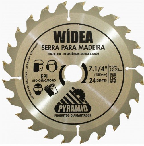 Disco de Serra Circular 7.1/4" (185mm) 24D Wídea p/ Madeira – Pyramid Cortes rápidos, precisos e com ótimo custo-benefício para madeira! O Disco de Serra Circular Pyramid 7.1/4” com 24 dentes de Wídea é ideal para cortes em madeira maciça, compensado, MDF e aglomerado. Sua geometria de dentes permite um corte eficiente, com menor esforço do equipamento e maior durabilidade. Indicado para uso profissional e doméstico. Especificações Técnicas: Diâmetro externo: 7.1/4" (185 mm) Número de dentes: 24 (Wídea – metal duro) Furo central (alojamento): 20 mm Espessura do disco: Aproximadamente 2 mm Velocidade máxima: Até 7.000 RPM Material dos dentes: Wídea (carboneto de tungstênio) Aplicação: Madeira, MDF, compensado, aglomerado Marca: Pyramid Aplicações: Cortes retos em madeira em geral Ideal para marcenarias, carpintarias e construção civil Compatível com serras circulares elétricas (manuais ou de bancada)