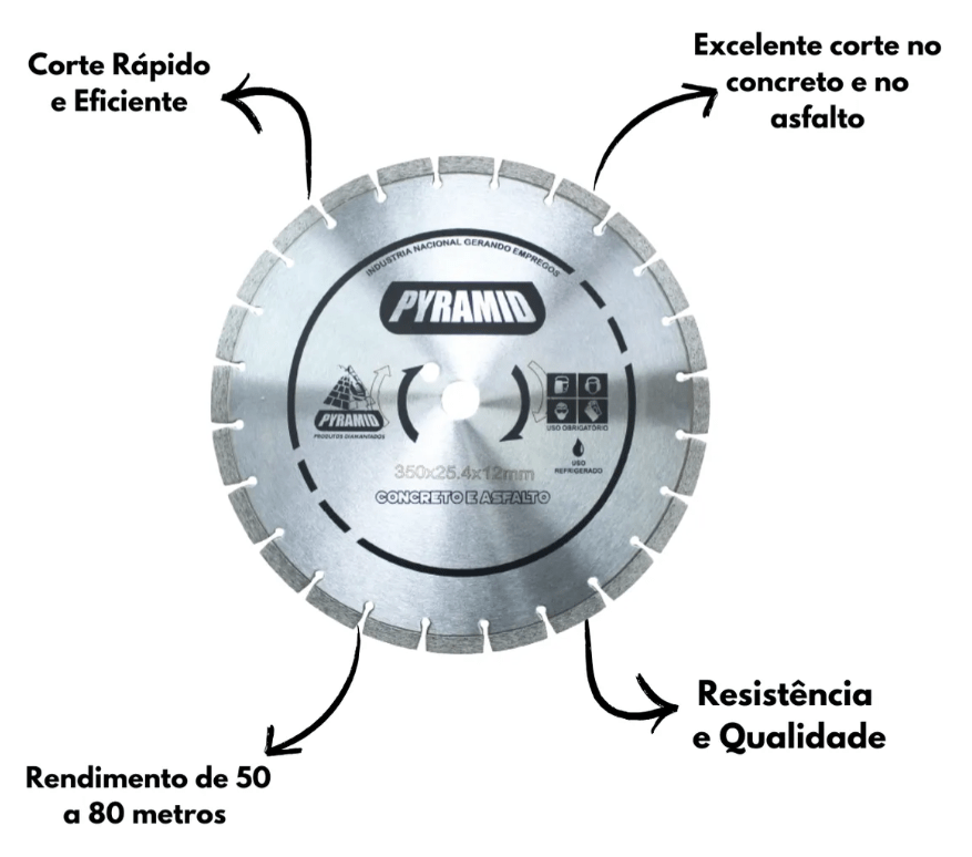 O Disco Diamantado PR-95 da Pyramid foi desenvolvido para cortes de alto desempenho em concreto, asfalto, concreto curado, pisos industriais e materiais abrasivos. Com diâmetro de 350mm e furo central de 25,4mm, ele se encaixa perfeitamente em cortadoras de piso, máquinas de bancada ou serras de piso, garantindo produtividade, durabilidade e precisão em obras exigentes.