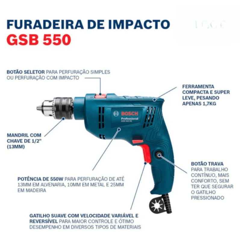Furadeira de Impacto 550W GSB550 com 3 brocas Bosch