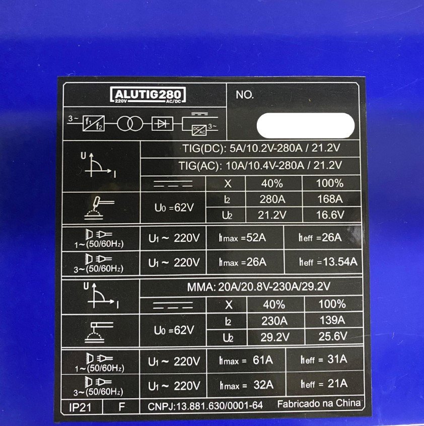 Inversora de Solda Tig HF e MMA ALUTIG 280 AC/DC Mono/Trifásica 220V -Boxer