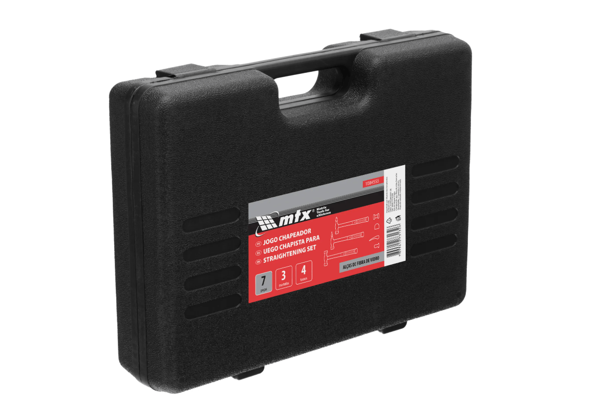 Jogo chapeador reparo automotivo 7 Peças 1084555 MTX Detalhes do Produto: Fabricado em aço especial de ótima resistência; Martelos com cabo emborrachado de ótima qualidade; Acompanha maleta plástica para armazenamento e transporte; Ideal para funilarias em geral. Composto por:01 Tasso Curva;01 Tasso Salto;01 Tasso Trilho;01 Tasso Duplo;01 Martelo Pena Reta;01 Martelo Face Plana;01 Martelo com Ponta Curta.