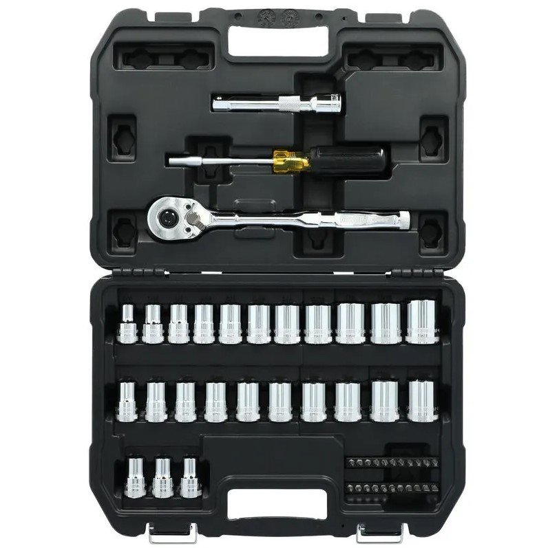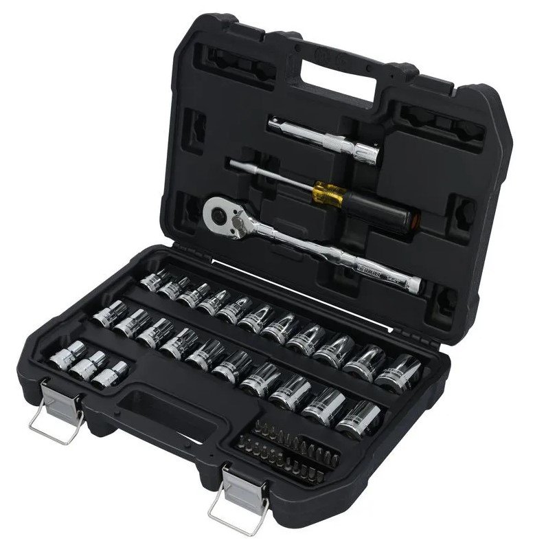 Jogo de Bits e Soquetes 1/2? com Catraca 144 Dentes – 49 Peças ref. DWMT45405 Dewalt O Jogo de Bits e Soquetes Dewalt DWMT45405 foi projetado para oferecer alto desempenho, precisão e durabilidade em aplicações profissionais e industriais. Composto por 49 peças, o kit inclui uma catraca de 144 dentes que garante máximo controle e suavidade nos movimentos, mesmo em espaços reduzidos. Tudo isso organizado em uma maleta robusta e compacta, perfeita para armazenar e transportar com segurança. Conteúdo do kit: 1 Catraca de 1/2" com mecanismo de 144 dentes (ângulo de giro de 2,5°) Soquetes sextavados de 1/2" (curtos e longos) Bits variados: fenda, Philips, Pozidriv, Torx, Allen Adaptadores e extensões Maleta resistente com trava e encaixes precisos Diferenciais: Catraca com 144 dentes: proporciona maior precisão e agilidade mesmo em locais apertados Soquetes com marcação a laser de fácil leitura Acabamento em cromo polido resistente à corrosão Sistema anti-deslizamento e fixação segura Produto com qualidade e robustez Dewalt Aplicações: Ideal para mecânicos, montadores, manutenção industrial, oficinas e uso profissional em geral. Itens inclusos no kit Dewalt DWMT45405: 1x Catraca 1/2? com 144 dentes (retorno de 2,5°; vida útil 4× mais longa) 24x Soquetes sextavados 1/2? (padrão MM/SAE, 6 pontos) 1x Barra de extensão 1/2? – 5? (˜12,7?cm) 1x Porta bit (bit driver) 22x Bits para chave de fenda, de tipos variados (fenda, Phillips, Pozidriv, Torx, Allen)