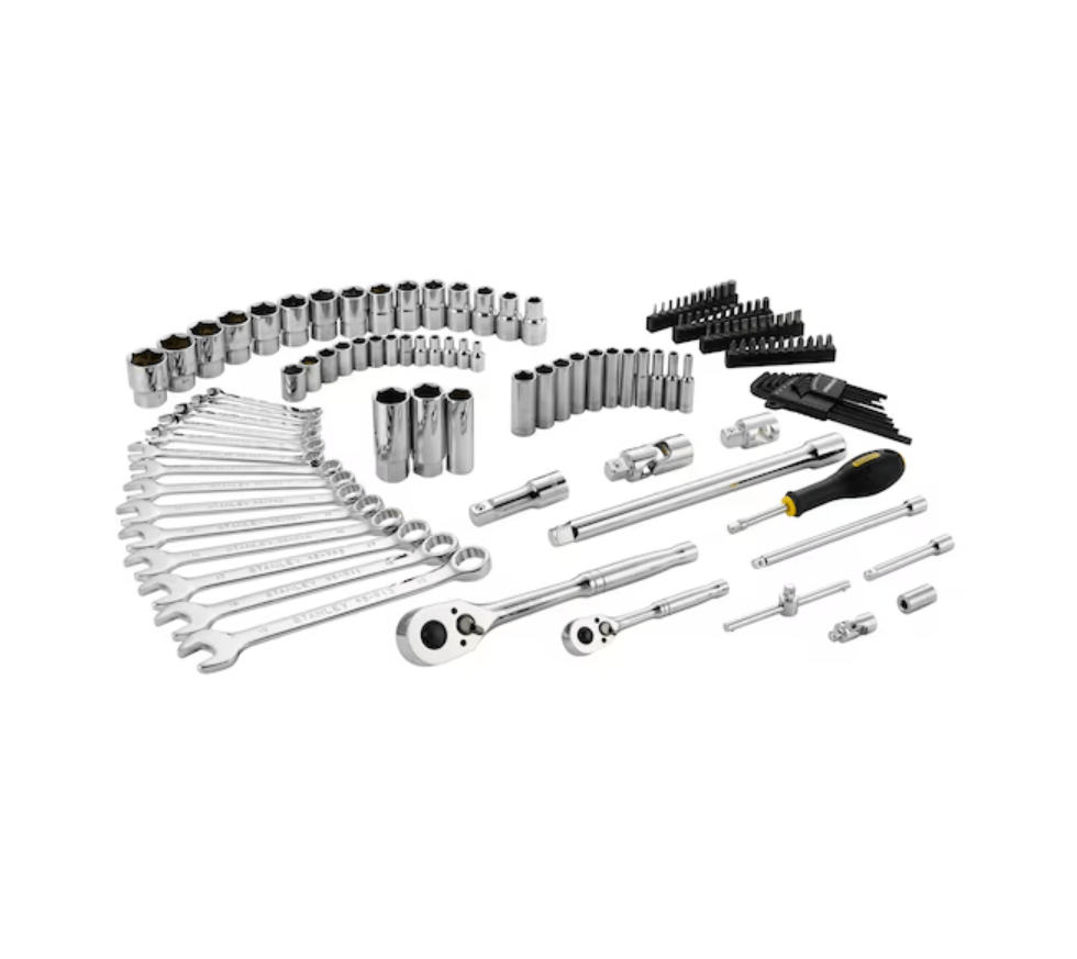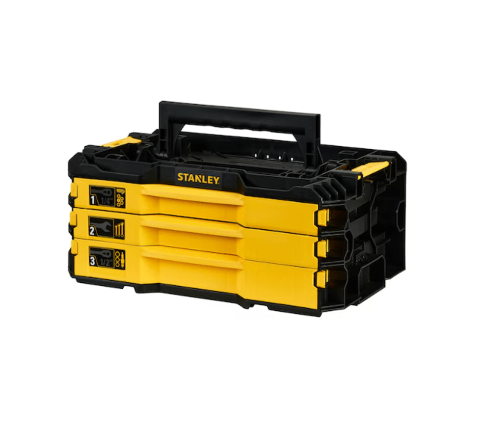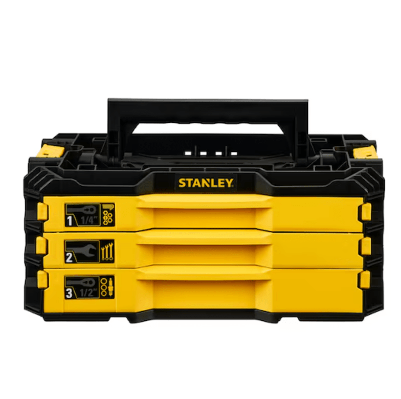 TUDO PRÁTICO E FÁCIL DE TRANSPORTARA caixa bau 3 gavetas com jogo de ferramentas mecanicas 126 peças STANLEY para profissionais inclui soquetes curtos e longos, soquetes de vela de ignição, extensões de acionamento de 1/4“ e 1/2”, catracas de cabeça de pera de acionamento de 1/4“ e 1/2”, adaptadores, bits de chave de fenda variados, chaves hexagonais, chaves combinadas e uma caixa com 3 gavetas.Ferramentas fabricadas com cromo vanádio que atendem às normas ANSI.Acabamentos cromados.Soquetes e chaves combinadas com sistema MAXI DRIVE que oferecem 15% a mais de torque.Sistema de armazenamento PRO-STACK compatível com o sistema T-STAK da DEWALT.