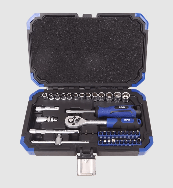 Quantidade: 41 peças Soquetes; Bits; Chaves Catraca; Extensões; Juntas; Adaptadores Material: Aço Cromo Vanádio