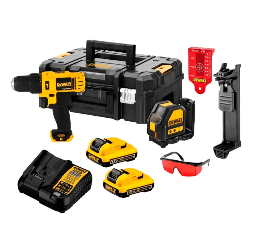 KIT COMBO PARAFUSADEIRA/FURADEIRA DE IMPACTO 12V DCD716 + NÍVEL A LASER DCE088 DEWALT DCK205D2TBR -COM 2 BATERIA 2AH,CARREGADOR,ÓCULOS,TSTAK O kit de parafusadeira e nível a laser é ideal para profissionais que desejam equipamentos robustos, de qualidade e potentes, lhe poupando tempo e esforço. A parafusadeira DCD716 é prática e versátil, ideal para realizar perfurações em metais, alvenaria e madeira, com velocidade mecânica entre 400 e 1500 rpm. Já o nível a laser DW088 garante melhor desempenho ao aprumar e nivelar. Possui indicador de bateria, revestimento em borracha para maior durabilidade e indicador de alinhamento vertical. Ideal para profissionais marceneiros, instaladores em geral, construção civil, etc. Especificações Técnicas Parafusadeira/furadeira de impacto DCD716: Bateria: 12V MAX Velocidade sem Carga 0-400 / 0-1.500 RPM Posições de embreagem: 15 Mandril de Aperto Rápido 3/8 (10mm) Função (Modo) Parafusadeira, Furadeira com Impacto Capacidade Madeira: 13/16” – 20mm Capacidade Metal: 3/8” – 10mm Capacidade Alvenaria: 5/16” – 8mm Iluminação: luz de led; Nível a laser DCE088: Bateria: 12V MAX* Alcance de até: 30m Precisão aprox.: +- 3mm a cada 9 metros Faixa máxima: 15 metros Conteúdo da Embalagem: 2 Baterias íon de lítio 12V Max DCB127 2.0Ah Carregador 12V/20V Máx Bivolt DCB107 Cartão Óculos Suporte com presilha Caixa TSTAK DWST17807 Garantia: 1 Ano Ref.: DEWALT-DCK205D2T-BR Marca.: DEWALT
