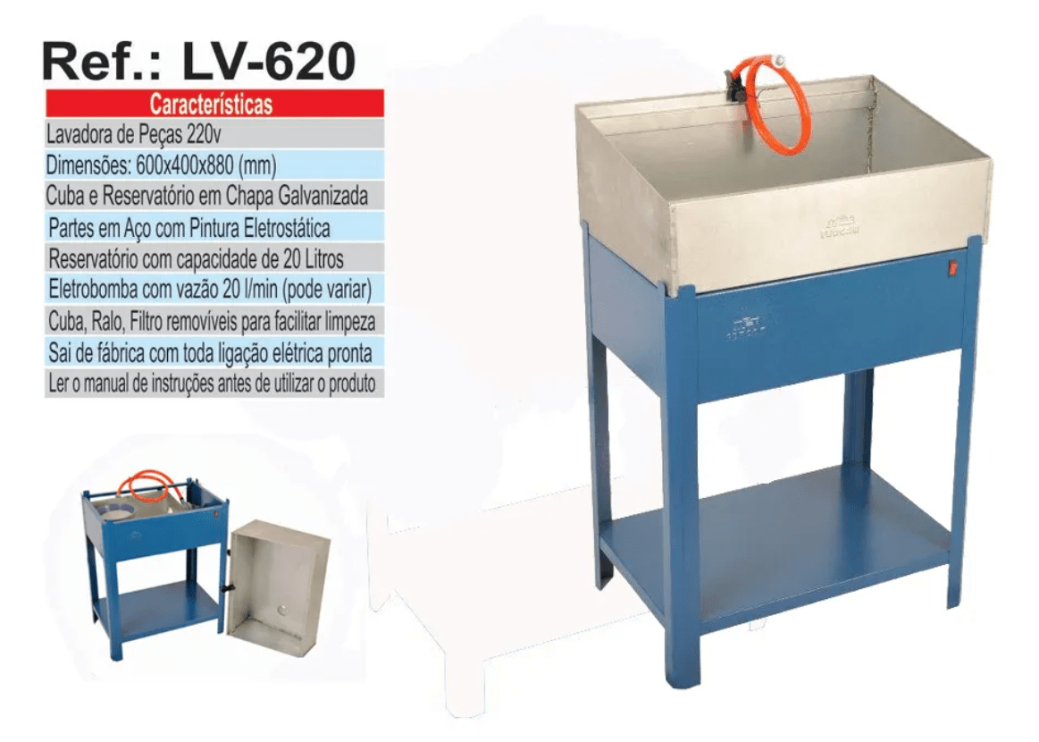 A Lavadora de Peças LV-620 da Fercar é a solução ideal para oficinas mecânicas, centros automotivos e indústrias que necessitam de uma limpeza eficiente e prática de peças metálicas. Com sistema de eletrobomba, proporciona uma lavagem contínua com reaproveitamento do solvente, otimizando o trabalho e reduzindo o desperdício.