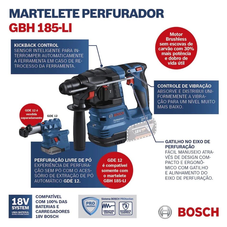 Martelete Perfurador/Rompedor 18V GBH 185-LI SB 1,9J 22MM Sem Bateria e Carregador -Bosch O martelete rompedor Bosch GBH 185-LI SB 18V é totalmente indicado para perfurações mais robustas por carga e potência, graças ao motor Brushless sem escovas de carvão. Conta com algumas tecnologias como o KickBack Control que reduz o risco de acidentes ao desligar instantaneamente a ferramenta em caso de travamento do acessório. Outra tecnologia que traz a ferramenta é o Vibration Control, que controla e reduz a vibração em até 50% nas mãos do operador. O martelete rompedor Bosch GBH 185-LI SB é compatível com coletor de pó automático GDE 12 e permite um trabalho livre de sujeiras. Indicado para uma série de atividades como montagem de paines, instalações e fixação de prateleiras. - Especificações Técnicas: Tipo do Encaixe do Mandril: SDS PLUS Impacto por Minuto: 0-4.675ipm N° de Rotações: 0-1800rpm Força de Impacto: 1,9 Sistema de Encaixe: SDS plus Motor: Brushless Peso: 2,3Kg Diâmetro máximo perfuração: - madeira 20 mm - aço 13 mm - concreto 22 mm Acompanha: 1 manual de instruções da ferramenta, 1 manual de instruções do carregador, 1 empunhadura auxiliar, 1 limitador de profundidade,