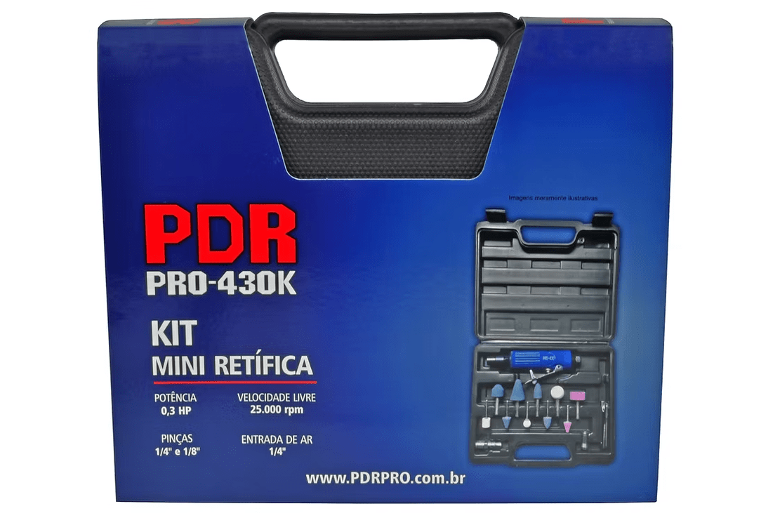 Kit Mini Retífica pneumática, indicada para oficinas, repintura automotiva, metalúrgicas, fábricas de móveis, manutenção industrial e fibra de vidro. Tipo: Reta, Mini retífica Potência: 0,3 HP Velocidade livre: 25.000rpm Pinça: 1/4" Peso: 0,3 Kg Pressão de trabalho: 90 psi Entrada de ar: 1/4" Consumo de ar médio: 15 pcm Acompanha: 2 chaves de boca. Peso bruto (maleta): 0,9 Kg Embalagem: 1 Maleta plástica com sleeve colorido Quantidade por caixa master: 10 unidades Maleta plástica contendo: - 1 Mini Retífica PRO-430 - 10 pontas montadas (5 para pinça 1/4" e 5 para pinça 1/8") - 1 Pinça 1/4" (na máquina) - 1 Pinça 1/8" - 1 Conector de ar 1/4" - 2 Chaves