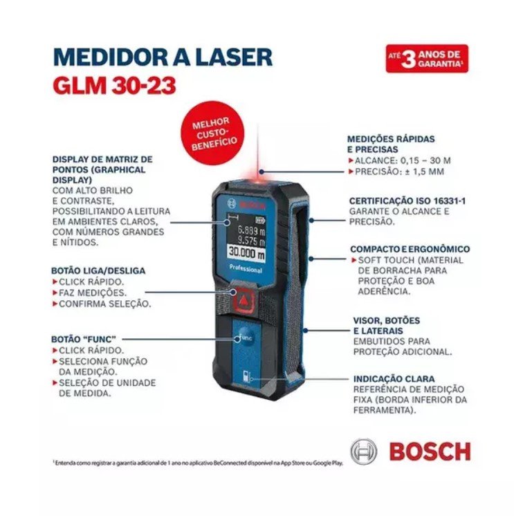 A trena laser GLM 30-23 Professional é a solução prática e fácil de utilizar para medições rápidas e exatas em ambientes internos. Esta ferramenta compacta permite uma medição intuitiva graças à interface do usuário moderna e com apenas dois botões. As medições são exatas e consistentes através do sistema de alta precisão e da certificação ISO 16331-1 que satisfazem as necessidades profissionais. Com múltiplas funções e unidades de medição, incluindo o comprimento, a área e a medição contínua, esta trena laser oferece um elevado grau de versatilidade. Ideal para os profissionais como assentadores de pisos, instaladores de drywall, pintores, carpinteiros e instaladores de HVAC, calcularem as necessidades em termos de material e orçamentos em ambientes internos. Tamanho compacto e interface moderna com apenas dois botões para comodidade e utilização facilitada. Informações Técnicas: Iodo laser 635 nm, : 1 mW Faixa de medição : 0,15 – 30,00 m Peso aprox. :0,09 kg Tempo de medição, típico : 0,5 s Classe de laser : 2 Precisão de medição, típica +- 1,5 mm? Tempo de medição máx. : 4,2 s Alimentação elétrica : 2 x 1,5 V LR03 (AAA) Dispositivo de desconexão automática : 5 min Unidades de medição : m/cm/mm Cor laser : Vermelho Faixa de medição, até : 30 metros Ref.: 0601072XG0